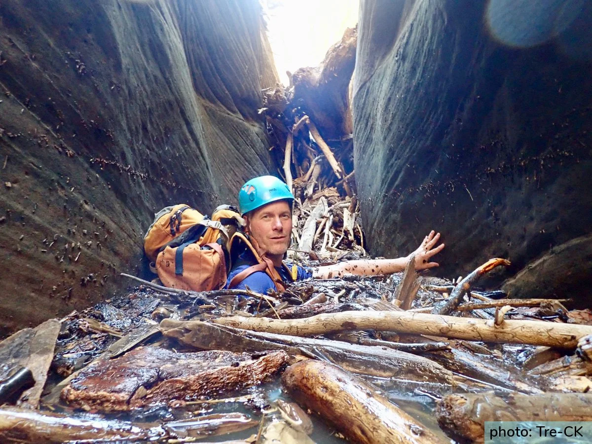 The next section I think of as The Corridors. Several long straight sections provide a few swims and short rappels, some of which can be downclimbed. This section collects wood and makes troublesome log soup at times. Without log soup, it takes half an hour to reach the first rap into the Extreme Narrows.